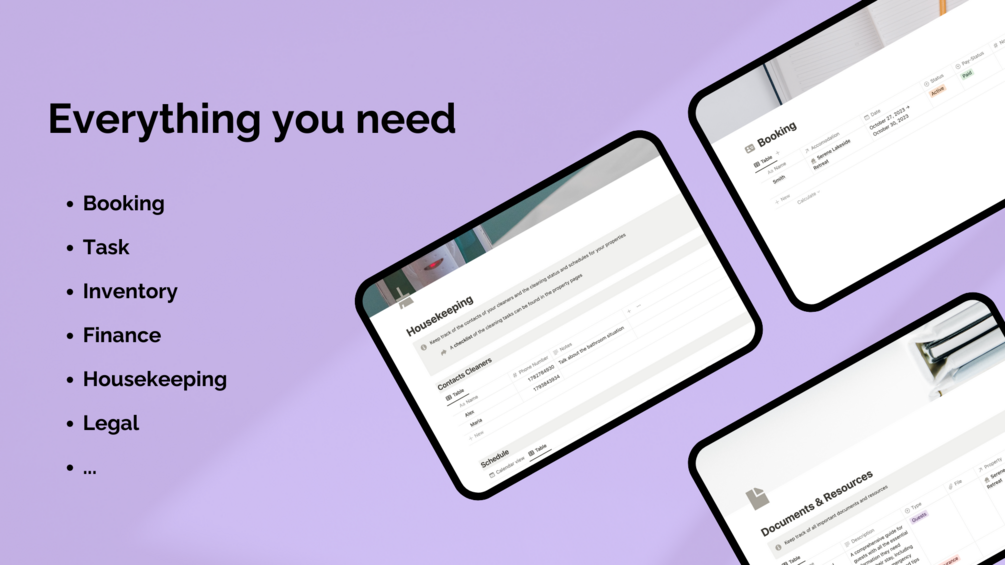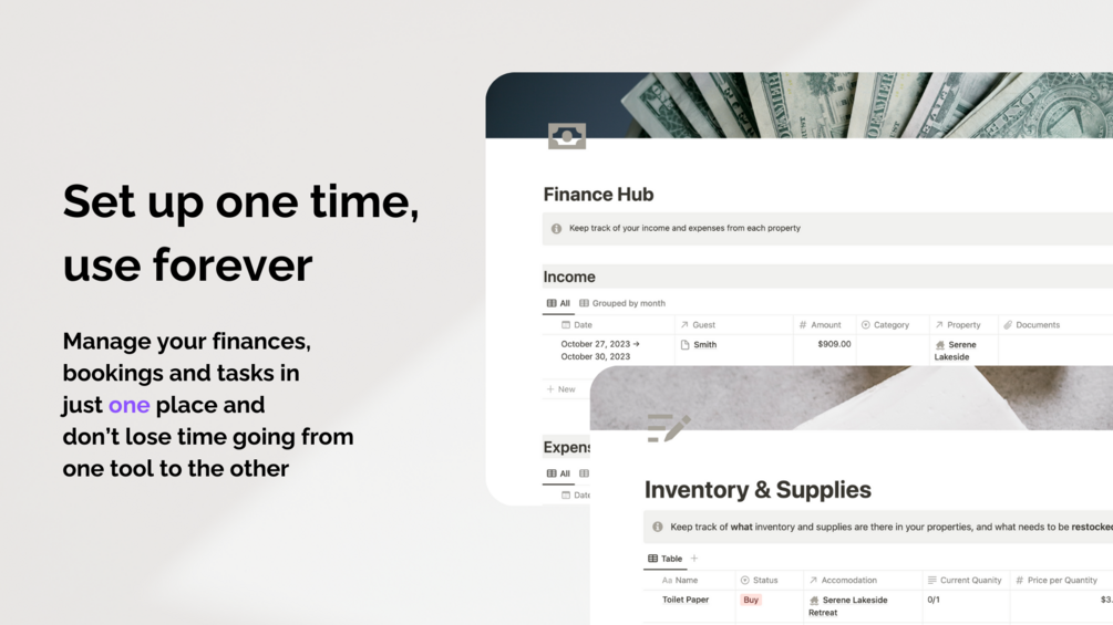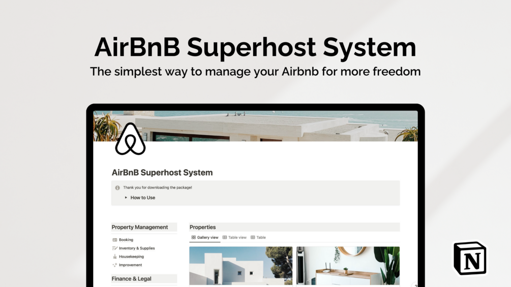 There are amazing tools to manage your rentals in the market, however, these options have three problems: they are usually expensive, you have to pay monthly, and sometimes they limit the rentals you can manage. With this Notion Template you'll only have to pay once, you can manage unlimited rentals and you'll obtain an all-in-one management space. The Airbnb Superhost System allows you to save money, save time and ultimately create less stress and more freedom to enjoy life.