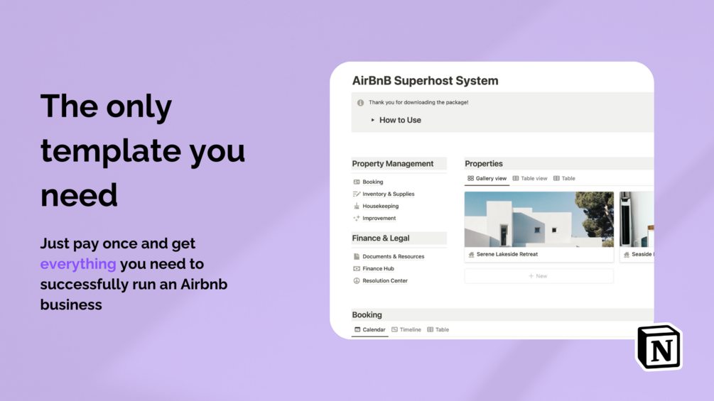 There are amazing tools to manage your rentals in the market, however, these options have three problems: they are usually expensive, you have to pay monthly, and sometimes they limit the rentals you can manage. With this Notion Template you'll only have to pay once, you can manage unlimited rentals and you'll obtain an all-in-one management space. The Airbnb Superhost System allows you to save money, save time and ultimately create less stress and more freedom to enjoy life.